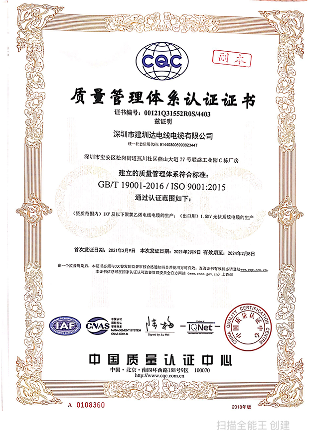 深圳建圳達(dá)電線電纜有限公司,成立于2000年,是一家電線電纜制造商,我們通過了世界各地不同市場的多數(shù)認(rèn)證,如:CCC、RoHS、CB、SAA、TUV、VDE、PSE、BPS、UL、CSA。我們根據(jù)定制產(chǎn)品不斷更新新的認(rèn)證。經(jīng)過數(shù)十年的發(fā)展,我們與來自世界各地的客戶建立了長期的合作關(guān)系。我們曾經(jīng)是菲律賓機(jī)場,,柬埔寨的電力站,美國的醫(yī)院,工廠,埃塞俄比亞的水電站項目。我們是一家值得信賴的電線供應(yīng)商。